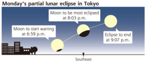 La prochaine éclipse partielle de Lune aura lieu l’année prochaine, tôt le matin de Avril 26, et sera visible principalement dans la partie occidentale du Japon.