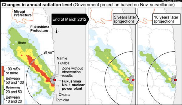 Sans travaux de décontamination, les résidents de sept municipalités autour des centrales nucléaires de Fukushima n ° 1 ne pourront pas rentrer chez eux pendant au moins cinq ans, d’après les cartes de projection de rayonnement du gouvernement. Les graphiques, basées sur une surveillance aérienne réalisée en Novembre, montrent des doses de rayonnement annuel prévues jusqu’à la fin de Mars 2032 dans les zones qui n’ont pas été décontaminés. Publiées pour la première fois lors d’une réunion le 22 Avril avec les responsables du comté de Futaba, dans la préfecture de Fukushima, les cartes seront utilisées pour aider les personnes évacuées et les municipalités a élaborer des arrangements pour leur retour dans leurs villes natales près de la centrale nucléaire.