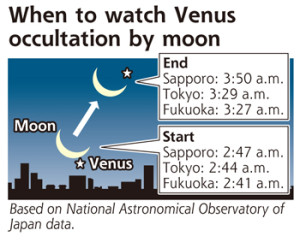 A Tokyo, la planète Vénus, sera occultée dans la direction Est-NordEst par le croissant de lune à partir de 02h44 et réapparaitra à 3h29. La prochaine occultation de Vénus par la Lune observable du Japon aura lieu en mai 2063.